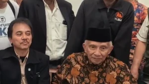 Former MPR Chairman Amien Rais attended the continuation of the citizen lawsuit hearing regarding the diploma of the 7th President of Indonesia, Joko Widodo (Jokowi), at the Solo District Court (PN Solo), Central Java, on Wednesday, February 18, 2026. The hearing was also attended by Roy Suryo, who is accused of making false claims about Jokowi's diploma.